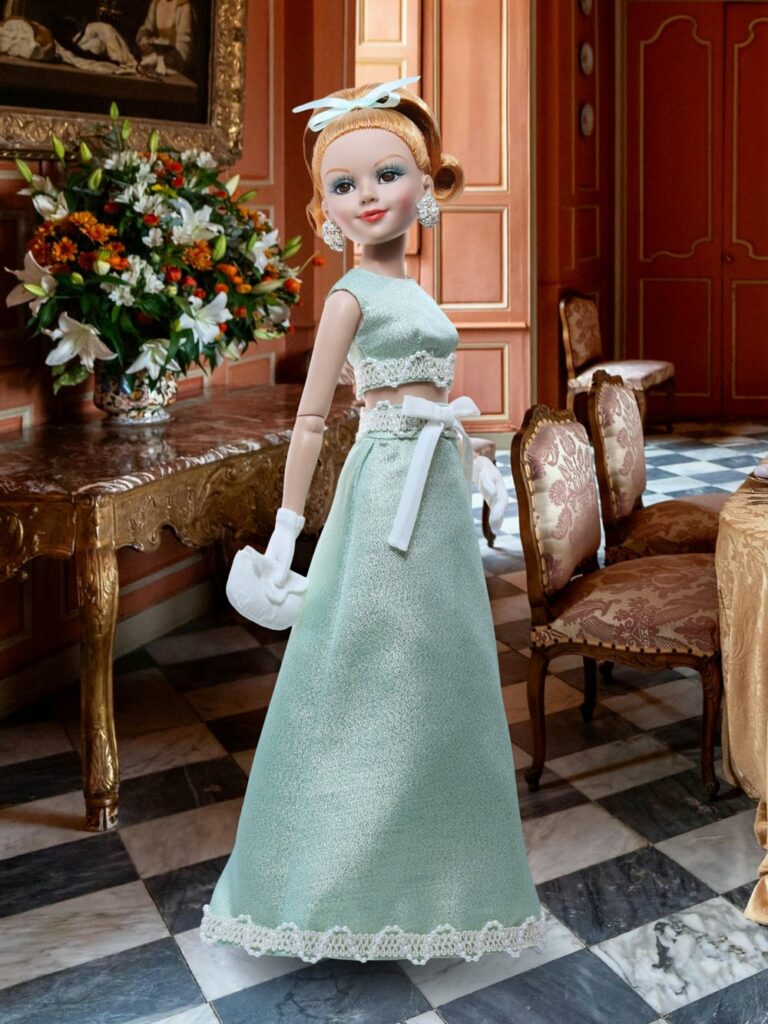 Une fois n’est pas coutume, je n’ai pas touché à la coiffure. Par contre, j’ai « gonflé » les pans de la robe avec du papier de soie pour un effet « robe à paniers ».