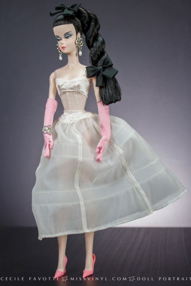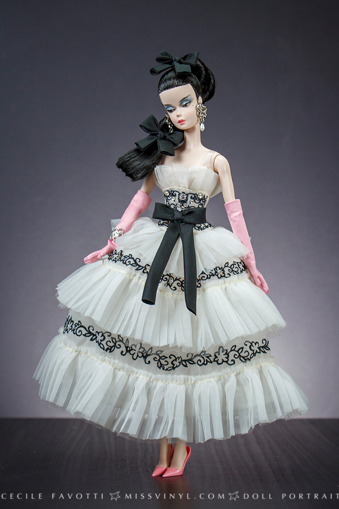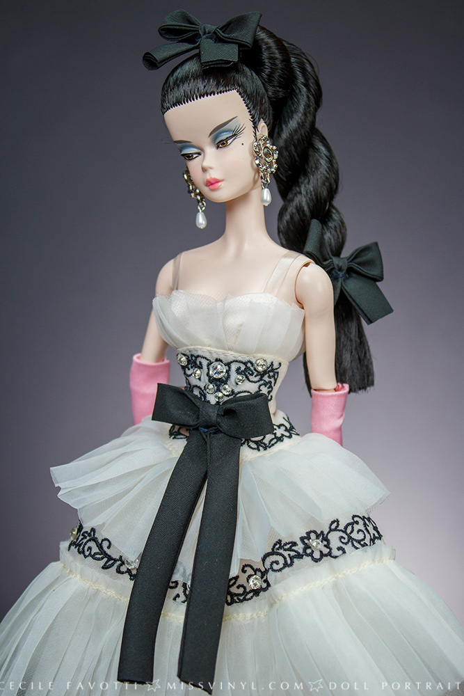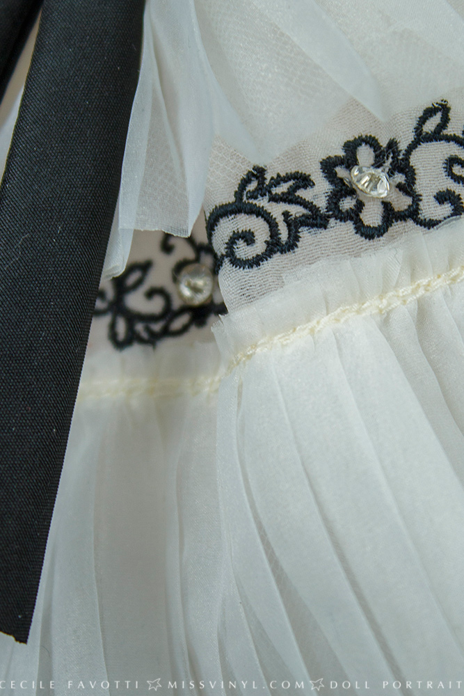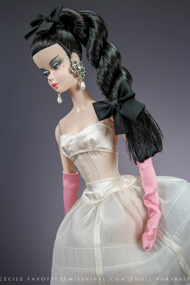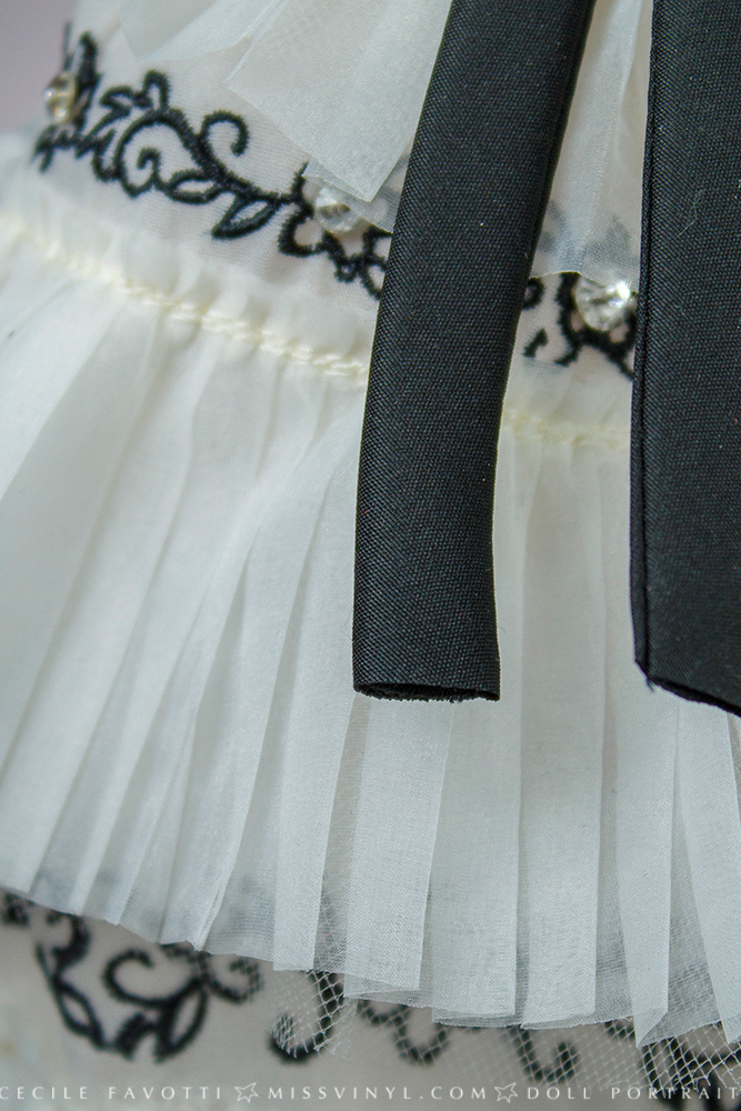La poupée est belle, même si les traits des cils et de l’eyeliner peuvent être un peu tremblotants. Profusion de nœuds et strass collés. Est-ce pour nous faire oublier la laideur de ses coutures approximatives et visibles en fil ivoire sur du blanc ?