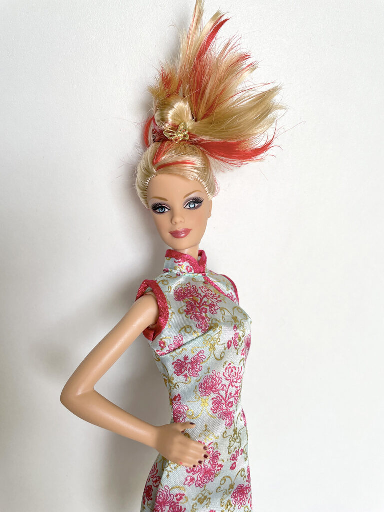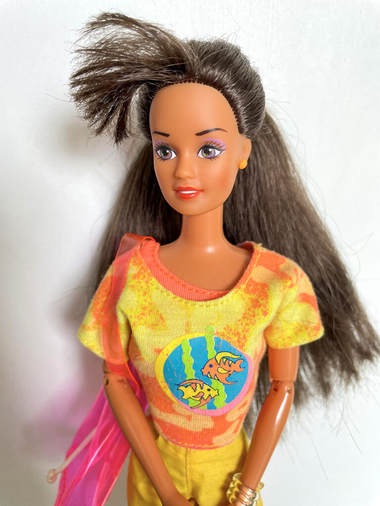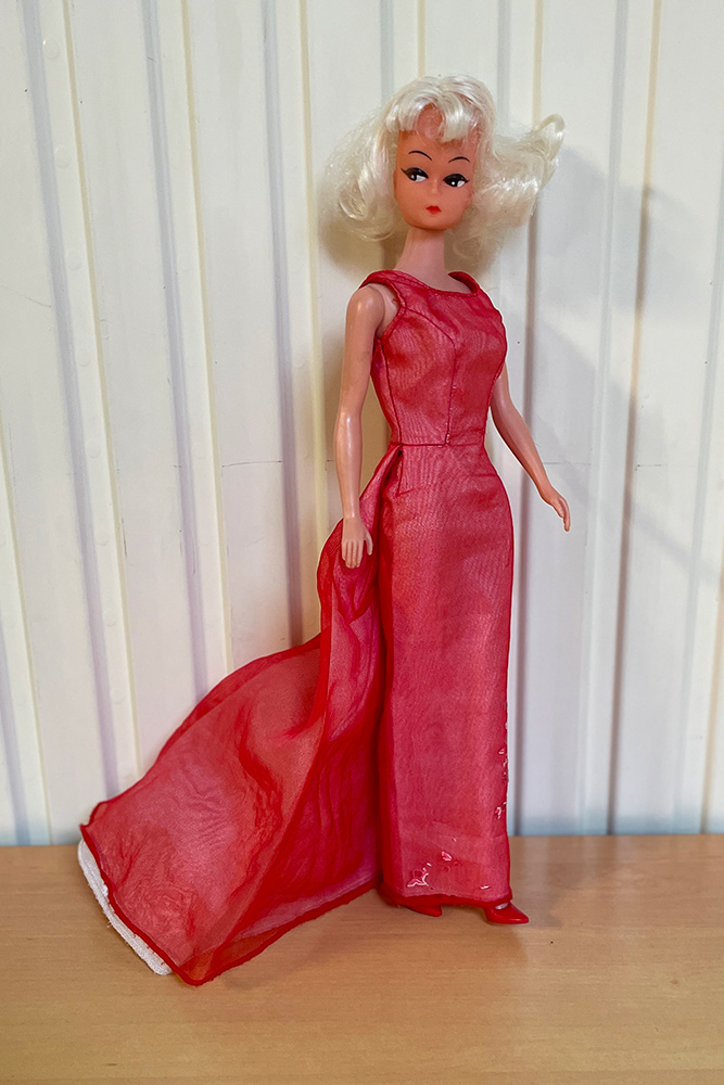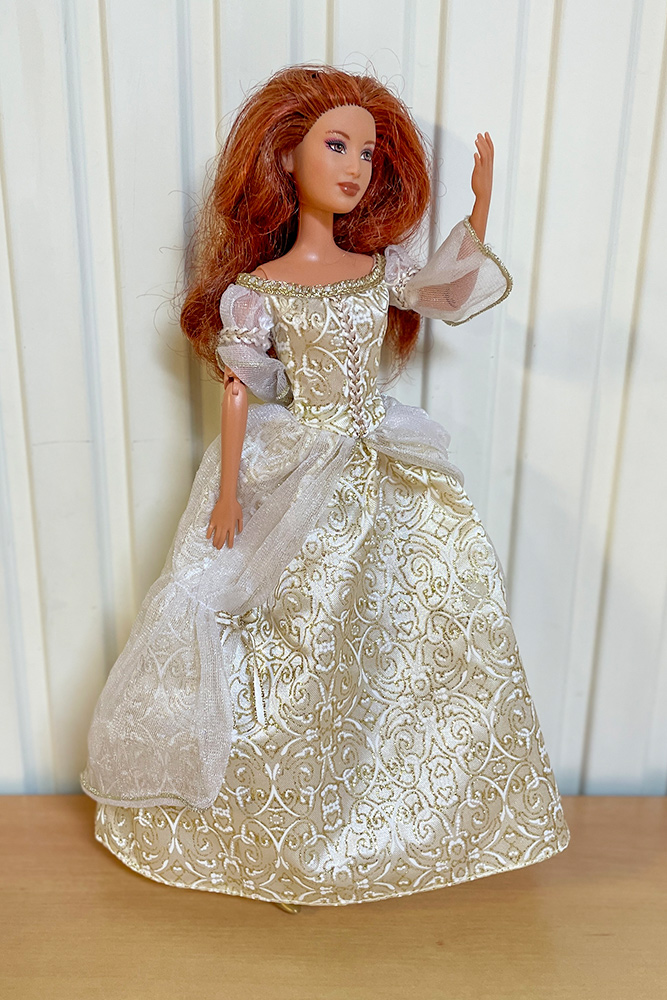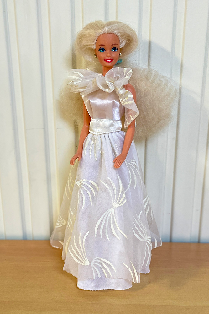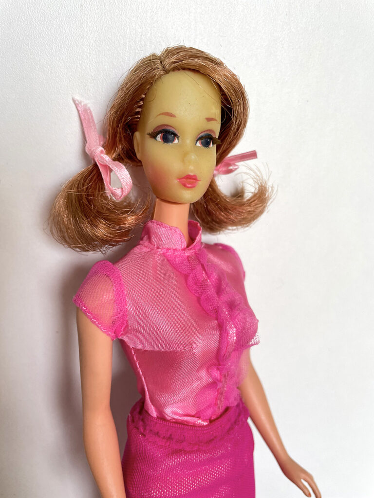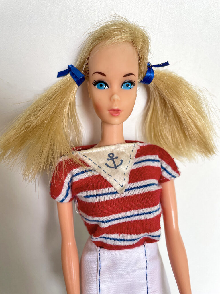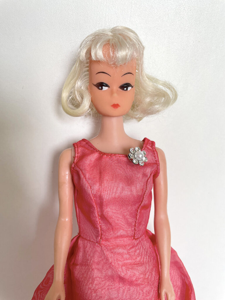 Véronique a apporté les poupées Barbie qu’elle souhaiterait vendre en vide-grenier, présentées avec une tenue complètement et harmonieusement disposées. Pour cela, elle apporte son stock de tenues et chaussures chinées de part et d’autre.