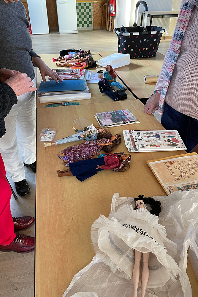 Véronique a apporté les poupées Barbie qu’elle souhaiterait vendre en vide-grenier, présentées avec une tenue complètement et harmonieusement disposées. Pour cela, elle apporte son stock de tenues et chaussures chinées de part et d’autre.